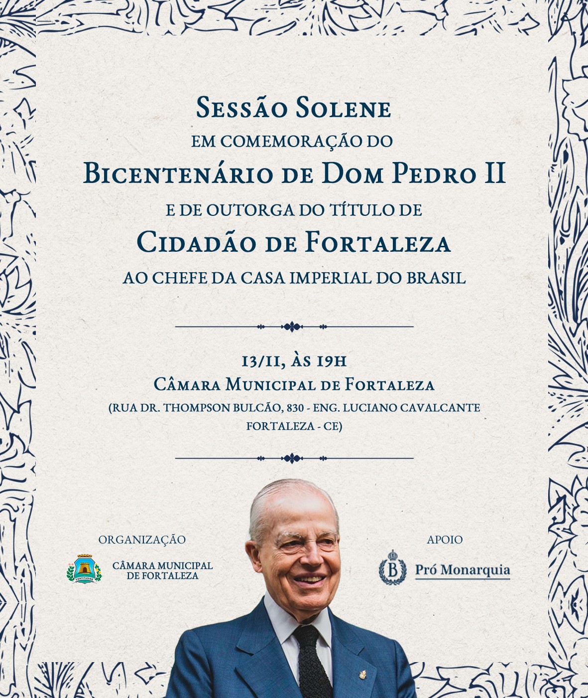 A Câmara Municipal de Fortaleza (CMFOR) realiza nessa quinta-feira (13) as 19 horas, sessão solene em comemoração ao Bicentenário de Dom Pedro II, organizada pelo vereador Jorge Pinheiro (PSDB-CE) com apoio de grupos monárquicos aqui do Ceará. Durante a cerimônia, o Príncipe Dom Bertrand de Orleans e Bragança será agraciado com o Título de Cidadão Fortalezense, em reconhecimento à sua trajetória e contribuição à preservação da história e dos valores culturais do Brasil e de Fortaleza.