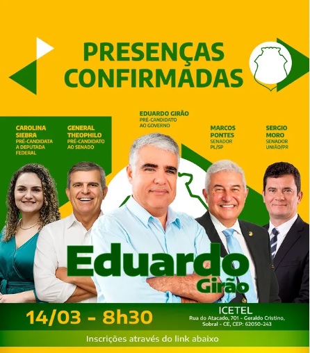 Entre os nomes confirmados estão previstas as presenças de lideranças estaduais e nacionais, a exemplo dos senadores Sérgio Moro (União Brasil RS) e Marcos Pontes (PLSP). O evento também contará com a presença do general Guilherme Theophilo (Novo-Ce), pré-candidato ao Senado, e da pré-candidata a deputada federal, Carolina Siebra (Novo-Ce). Presidente estadual do Partido Novo, Érick Paiva, além de outros nomes ligados à direita também confirmara participação.
