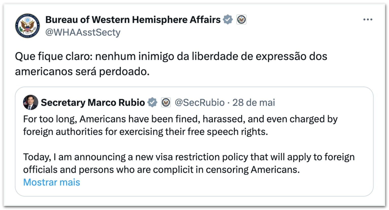 O tweet comenta o anúncio de 4ª feira (28.mai) de Rubio, de que o país vai impor restrições de visto a líderes e autoridades estrangeiras considerados cúmplices de censura contra cidadãos norte-americanos.