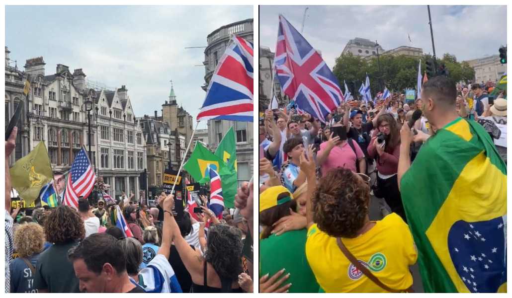 Vídeos do evento mostram bandeiras brasileiras e mensagens de apoio à anistia, enquanto os manifestantes compartilhavam informações e abraços com os londrinos.