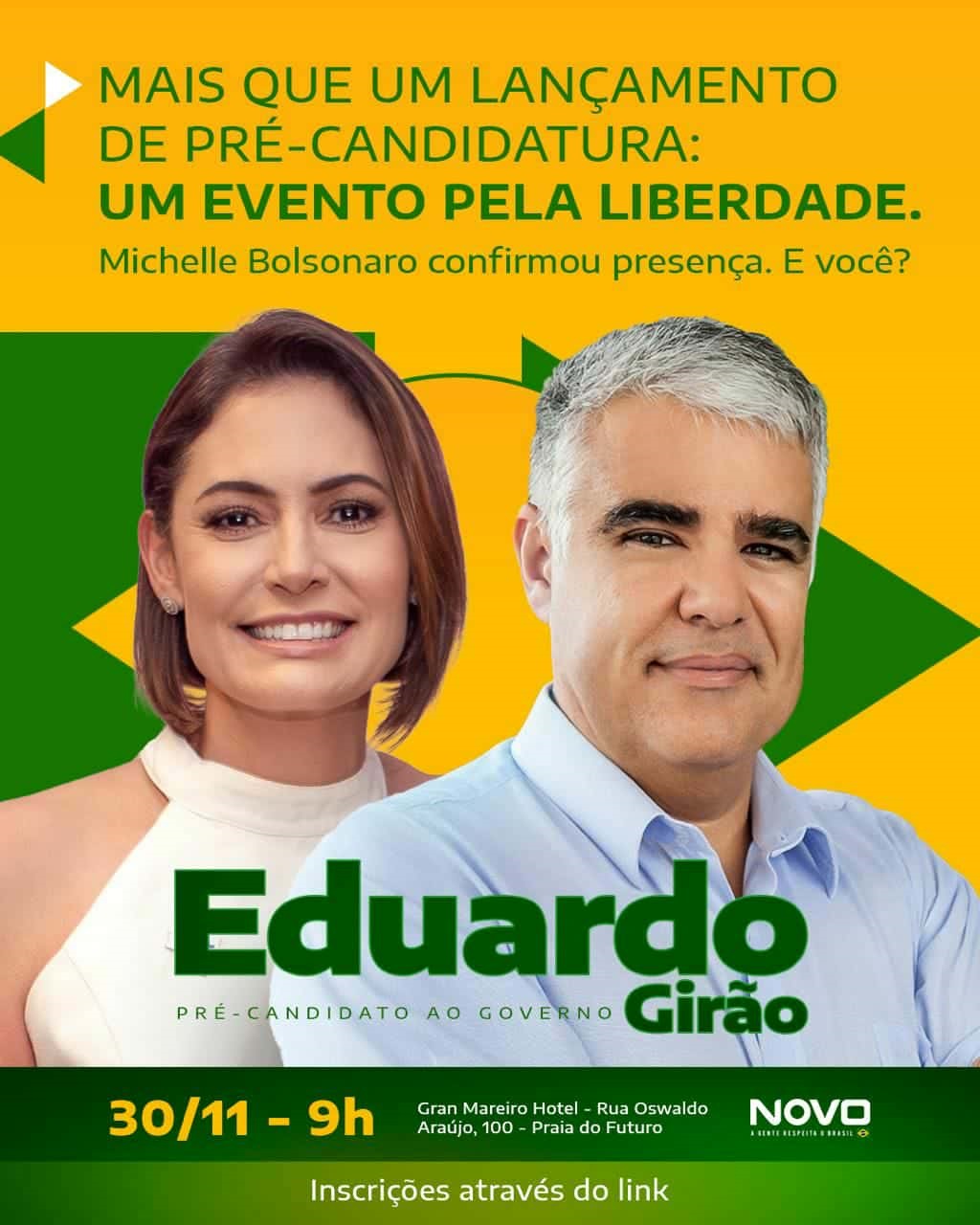 O senador Eduardo Girão (NOVO-CE) oficializa neste domingo sua pré-candidatura ao Governo do Estado do Ceará. O evento ocorrerá no dia 30 de novembro, às 9h, no Hotel Gran Mareiro, na Praia do Futuro, em Fortaleza. Ao confirmar a decisão, Girão afirmou que o Ceará precisa “abrir um novo ciclo político pautado por propostas verdadeiras, crescimento econômico, saúde eficiente e o combate real à violência”. O evento contará com a presença de diversas políticos a nível nacional (Zema, Sostenes, Van Hattem, Bia Kicis, Magno Malta), mas a que chama mais a atenção é a ex-primeira-dama Michelle Bolsonaro.