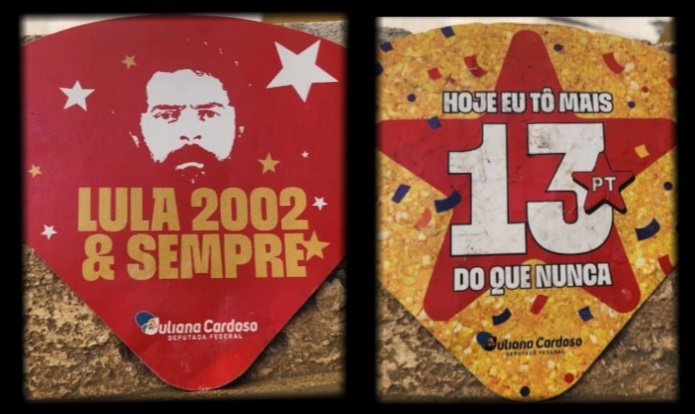 Outro abanador, distribuído pela deputada federal Juliana Cardoso (PT-SP), contém os dizeres: “Hoje eu tô mais 13 do que nunca” e “Lula 2002 e sempre”, em alusão à primeira vez que o atual mandatário foi eleito. Ao Metrópoles, a deputada disse que tem o costume de fazer materiais de divulgação do trabalho parlamentar e do PT. Ela afirma que os leques distribuídos nos blocos não são propaganda eleitoral antecipada pois “não há pedido de voto e nem menção à candidatura” do presidente.