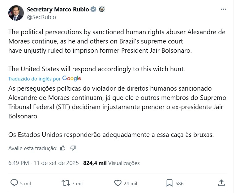 O secretário Marco Rubio criticou nesta quinta-feira (11) a decisão do Supremo Tribunal Federal (STF) que condenou o ex-presidente Jair Bolsonaro (PL) a 27 anos e 3 meses de prisão no processo do suposto golpe de Estado. No X ele comentou “As perseguições políticas do violador de direitos humanos sancionado Alexandre de Moraes continuam, já que ele e outros na Suprema Corte do Brasil decidiram injustamente prender o ex-presidente Jair Bolsonaro. Os Estados Unidos responderão a essa caça às bruxas”, afirmou.